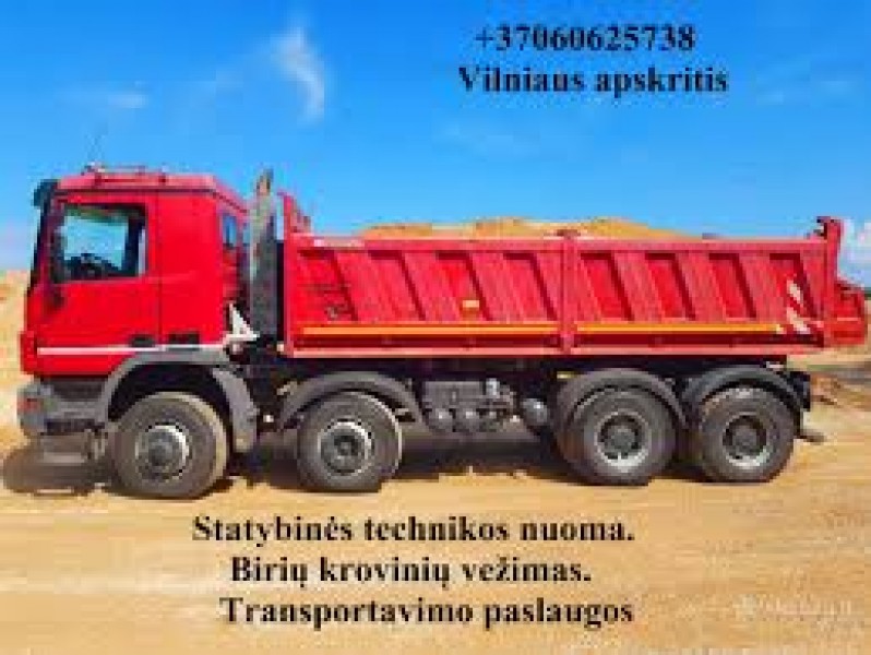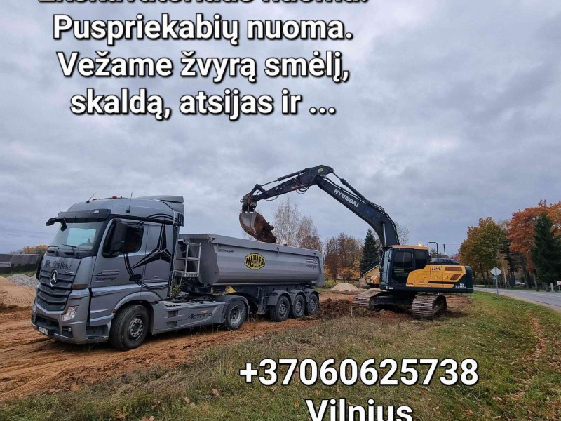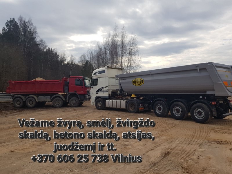 VEŽAME Juodžemį, augalinį sluoksnį, durpes, žvyrą (įvairių frakcijų), smėlį (įvairių frakcijų ir plautą), skalda, betoninę skaldą, akmens dulkes, trupintą betoną, frezuotą asfaltą ir kitas.