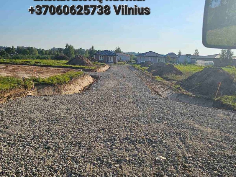 Tvenkinių, prūdų kasimas, šlaitų formavimas, kelių įrengimas/išlyginimas, ruošiame įvažiavimus į sklypus, atliekame pagrindus keliams, namų statybai, trinkelių klojimui, užkasame griovius, grunto atvežimas, pervežimas, pakrovimas, nuėmimas, žemės kasimas, lyginimas, planiravimas, stumdymas, užpilame pamatus, tranšėjų kasimas, duobių pamatams kasimas, juostinių pamatų kasimas, juodžemio, augalinio sluoksnio skleidimas, sklypo reljefo tvarkymas, kanalizacijos žiedų montavimas, polių gręžimas ir kiti panašaus pobūdžio darbai.