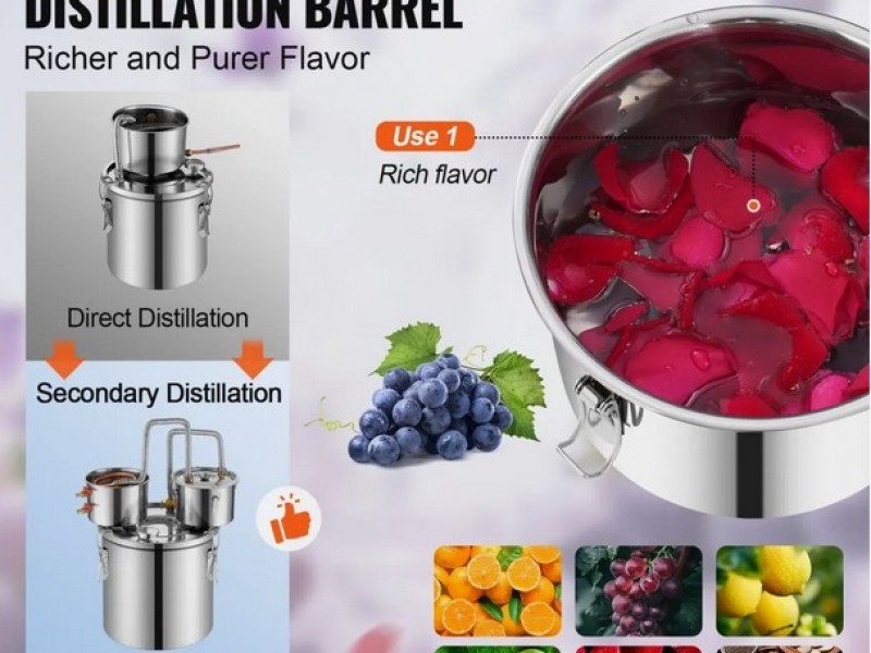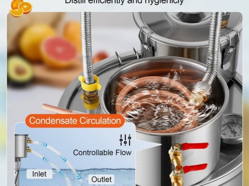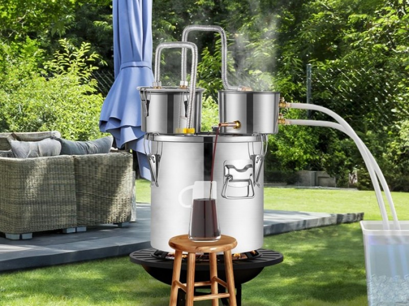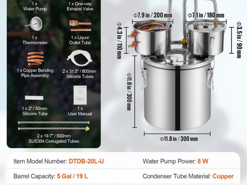 Distiliatoriaus rinkini sudaro: vienas 20l nerudijancio plieno katilas, vienas kondensatorius su saldančiu nerudijancio plieno vamzdeliu, vienas papildomas kondensato sodrinimo puodas, vienas oro voztuvas fermentavimui, vienas termometras, vienas isleidimo voztuvas ir du silikoniniai vamzdeliai, du gofruoto, nerudijancio plieno vamzdeliai, termometras, elektrine vandens pompa.