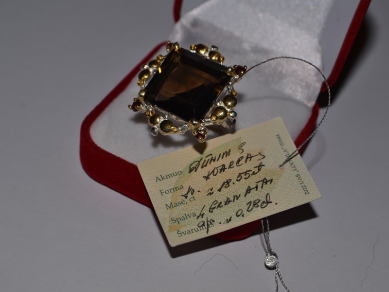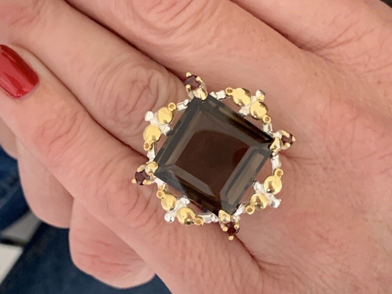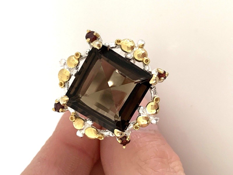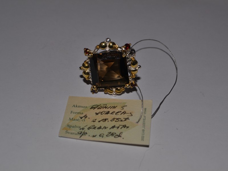 Naujas ispudingas labai grazus dizainerio sidabrinis ziedas su didziuliu duminiu kvarzu 18,55 ct centre ir 4 granatais 0.28ct