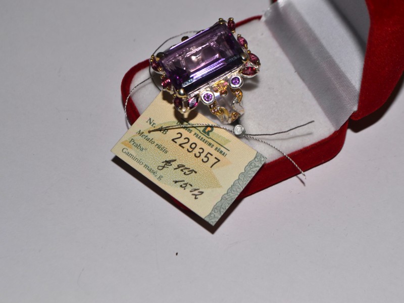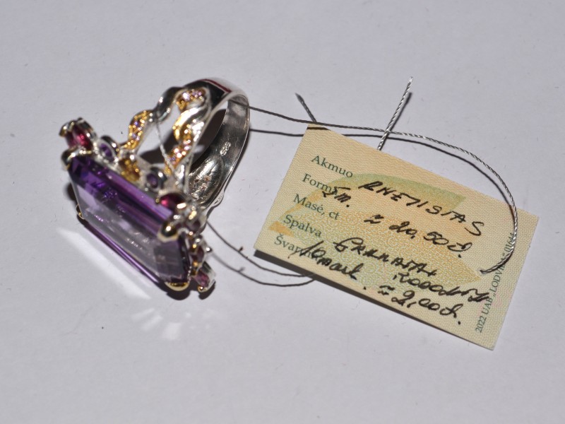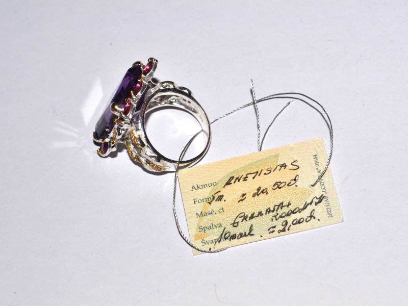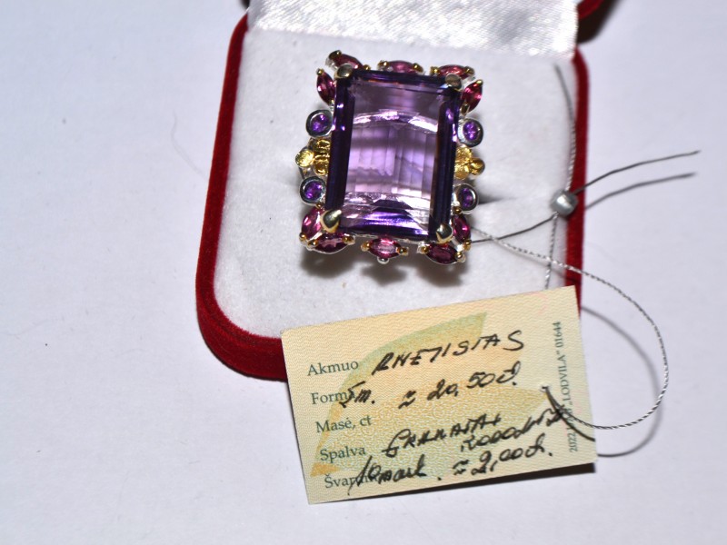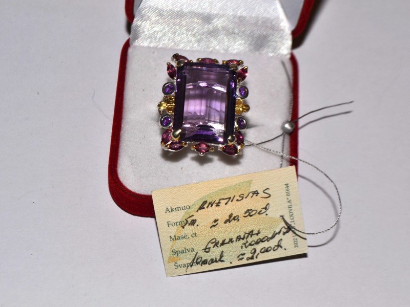Naujas ispudingas labai grazus dizainerio ziedas su didziuliu ametistu 20.50 ct centre, granatais ir rodolitais 2,00 ct! Brangakmeniai!