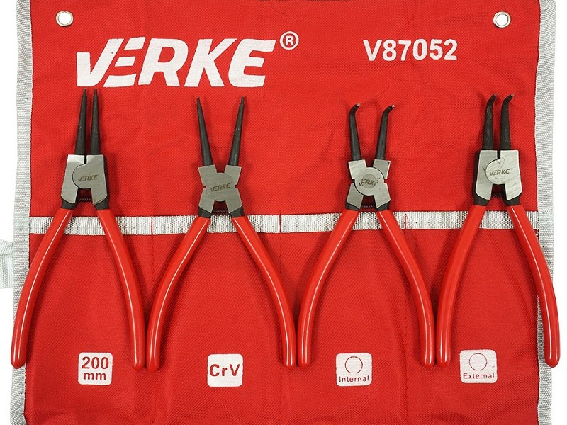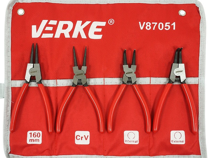 Fiksavimo žiedų replės, rinkinyje 4 vienetai replių, vidiniams ir išoriniams fiksavimo žiedams, tiesios ir lenktos, 160mm arba 180mm.