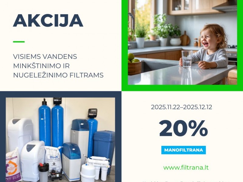 Nuo 2025-11-22 iki 2025-12-12 taikome 20% nuolaidą visiems vandens minkštinimo ir geležies šalinimo filtrams su kodu: MANOFILTRANA. ⏳
